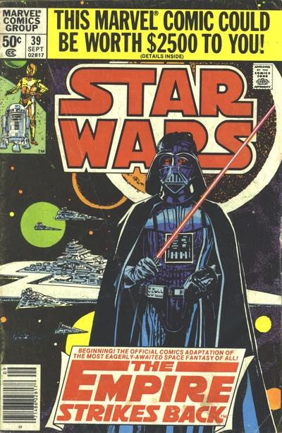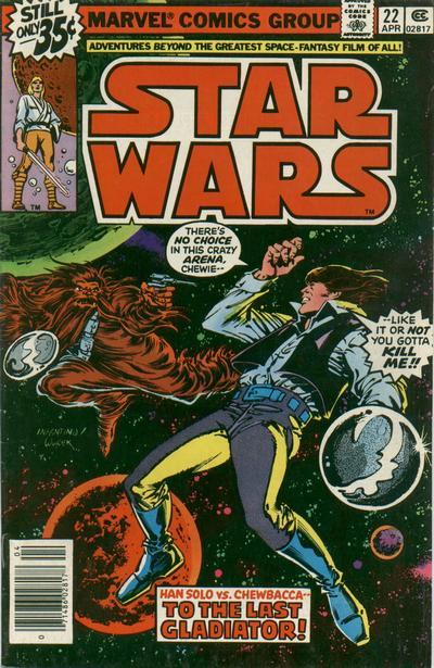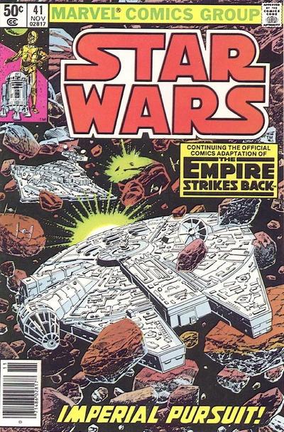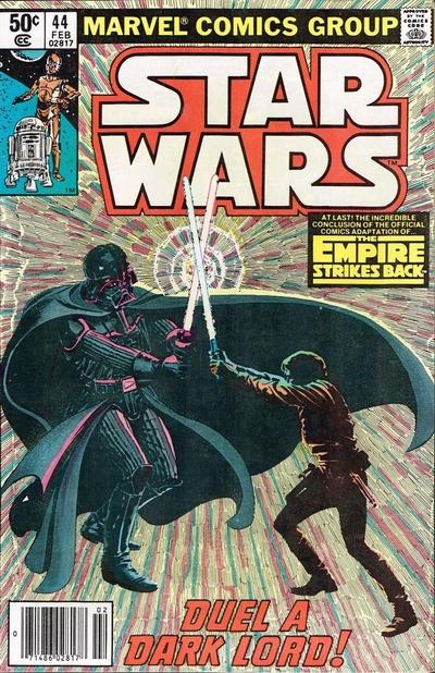 Finalmente, abril de 1977 -aunque aparezca julio en la portada- fue la fecha en que salió el primer número del cómic de Star Wars, con Roy Thomas a los guiones y Howard Chaykin a los lápices. Los primeros seis números de la serie adaptaban la primera película, Star Wars, o sea, La guerra de las galaxias, tal y como se la conoció aquí, en España, para más tarde pasar a serlo como Episodio IV: Una nueva esperanza. Después comenzaron a narrarse historias originales creadas por el propio equipo editorial hasta la llegada de la continuación cinematográfica, El Imperio contrataca, adaptada y publicada entre los números #39 y #44 de la serie. El retorno del Jedi, la tercera entrega, en cambio, sería adaptada fuera de la colección, en una serie limitada de cuatro números guionizados por el gran Archie Goodwin y dibujada por el mítico Al Williamson, responsables de las tiras de prensa Star Wars desde 1981, tras el fin de una primera etapa iniciada dos años antes por Russ Manning y compañía.