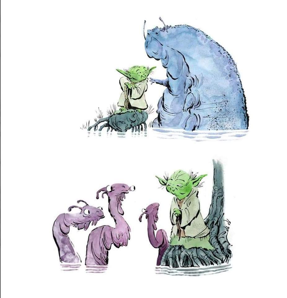Preeti Chhibber: Estoy obsesionada con el arte de Mike. Creo que es realmente uno de los mejores trabajos de Star Wars que he visto. Su Yoda podría ser mi Yoda favorito. Es tan lindo y reconfortante…. Los colores pasteles son atractivos y, nuevamente, tienen esta sensación de comodidad.