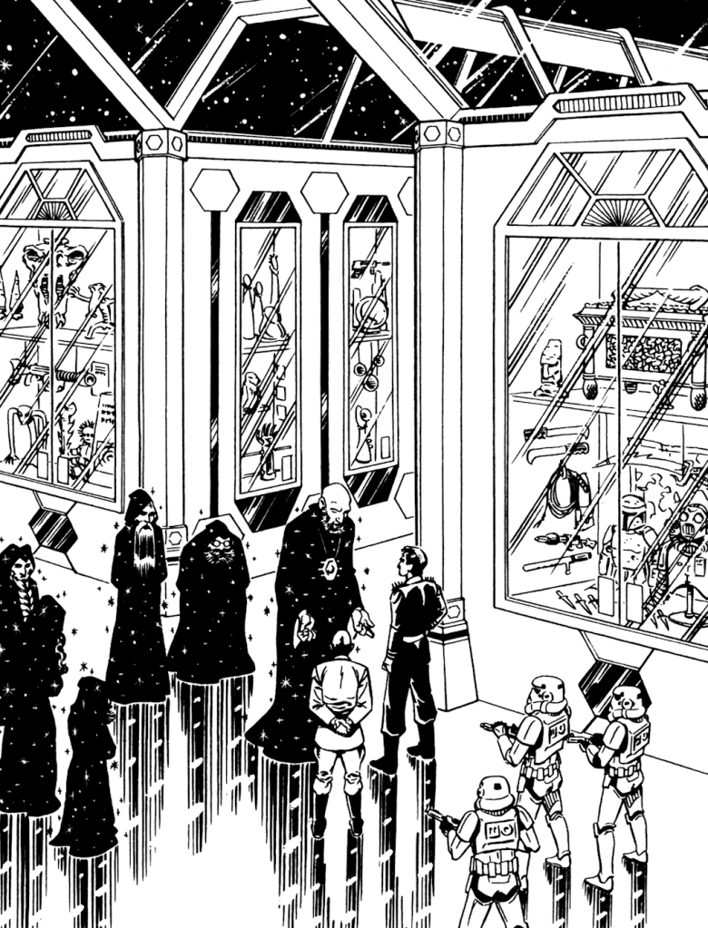 Para rematar, os dejamos con esta ilustración de las reliquias almacenadas en la estación espacial Scardia. Si ya empezáis a peinar canas os sonará alguna ilustración de otra franquicia 😉