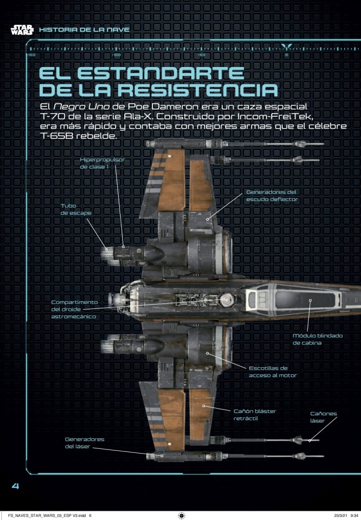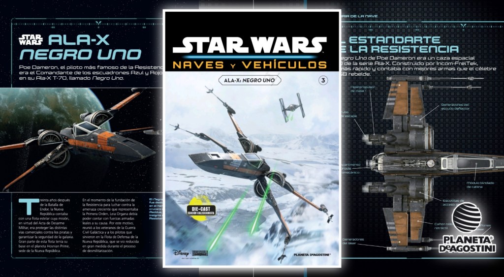 Además, cada entrega llevará una revista informativa con datos de la nave o vehículo en cuestión. El tercer número no podía ser otra nave que el Ala X Negro Uno de Poe Dameron, con datos técnicos del famoso Ala X multicolor, sobre su piloto y los momentos destscados de esta nave en la trilogía de secuelas de Star Wars. Si nuestras informaciones no nos fallan, debería salir a principios de junio hacia todas vuestras casas si estáis suscritos.