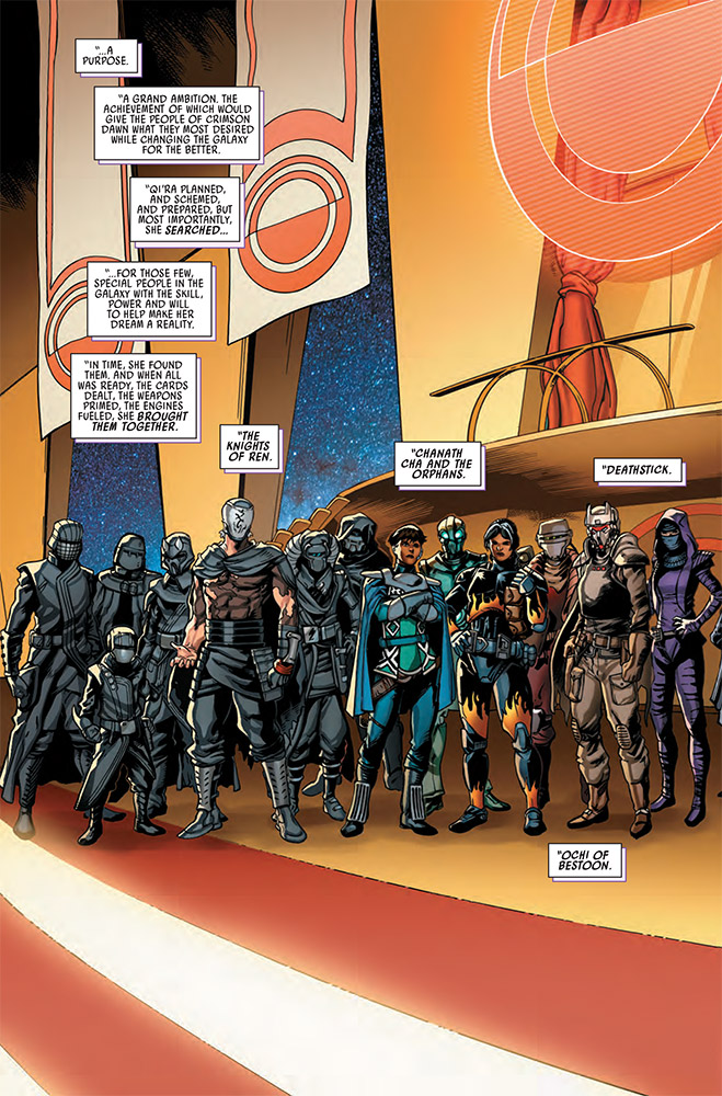 En éste avance exclusiva de Star Wars: Crimson Reign #1 de Marvel, descubre el nuevo objetivo del antiguo scrumrat en la era del Imperio. Entre sus nuevos aliados se encuentran Ren y sus caballeros, Ochi of Bestoon, e Imara Vex, quienes también aparecerán en el próximo juego Star Wars: Hunters. El número llega en diciembre, el segundo capítulo de una trilogía que comenzó con el evento War of the Bounty Hunters, continuando la saga de Qi’ra y el sindicato criminal Crimson Dawn.