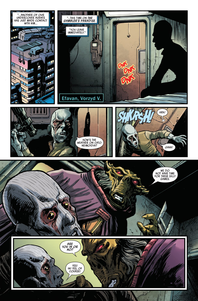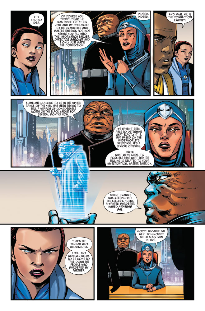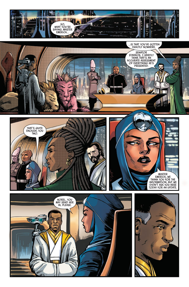 En Star Wars The High Republic: Trail of Shadows #2 de Marvel, el Maestro Jedi Emerick y el Investigador Privado Sian Holt se cruzarán a medida que la trama se complica, y la Canciller Soh revela nueva información que vincula la muerte del antiguo socio de Holt, un agente encubierto de la República, ante las desastrosas consecuencias de la Feria de la República.