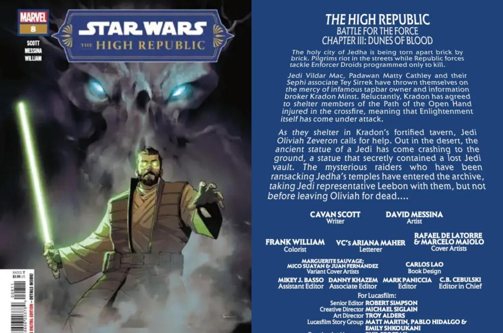 Un Jedi yace moribundo en el desierto congelado de Jedha, y otro ha desaparecido. ¡TERROR EN LAS DUNAS DE SANGRE! ¿Podrán Vildar, Matty y Tey escapar del asedio de la Iluminación a tiempo para salvarlos a ambos? Y el Leveler espera en las sombras, desesperado por alimentarse.