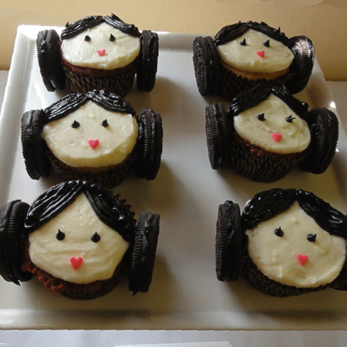 Esta receta es muy sencilla, podemos hacer las magdalenas caseras o comprarlas hechas, y solo nos quedará la decoración del tipo STAR WARS! Para comenzar extendemos una capa de chocolate blanco que previamente habremos calentado al baño maría para que se derrita. En lugar de chocolate blanco, podemos usar también azúcar glaseado. Se consigue de forma muy fácil: calentamos azúcar glasé en un cazo al fuego y le vamos añadiendo agua, siempre removiendo para que se vaya espesando. Con la ayuda de un cuchillo o un palillo, vamos haciendo la forma de la Princesa Leia. Después le ponemos la boca con una gominola en forma de corazón. Para los moños del pelo usamos dos galletas Oreo, una a cada lado de la magdalena y para quitar la línea blanca de la galleta usamos otra vez glaseado negro. ¡Riquísimo!