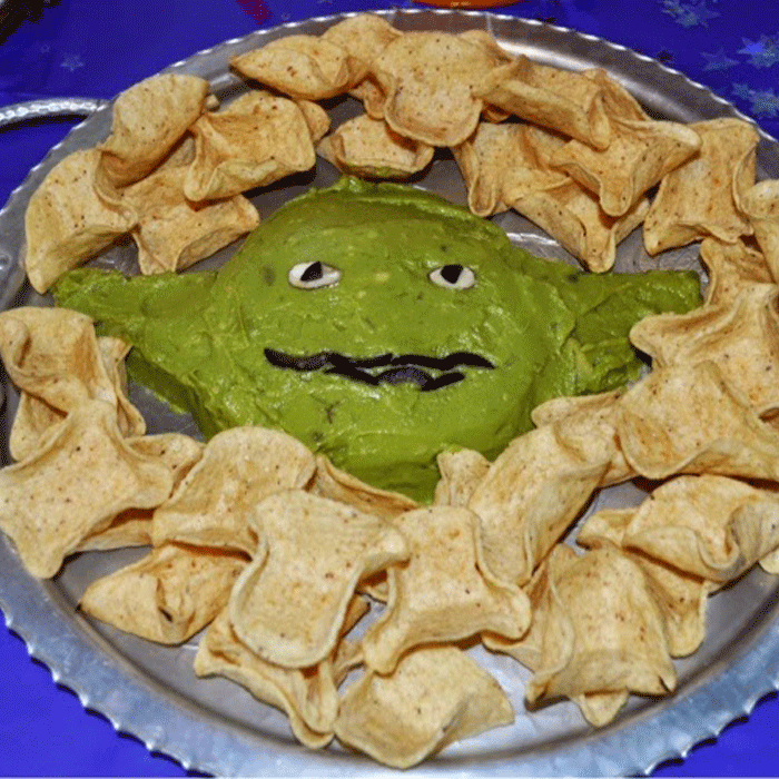 Esta es la receta más sencilla de las que te proponemos. Perfecta para picotear algo mientras ves la película. Lo primero que tienes que hacer es preparar un buen guacamole sabroso e ir dándole forma hasta conseguir la cabeza de Yoda. Con ayuda de unas aceitunas negras podemos hacer los ojos y la boca. Lo acompañamos de nachos, patatas fritas o lo que nos apetezca y ¡listo! Ahora sí, a disfrutar de la peli.