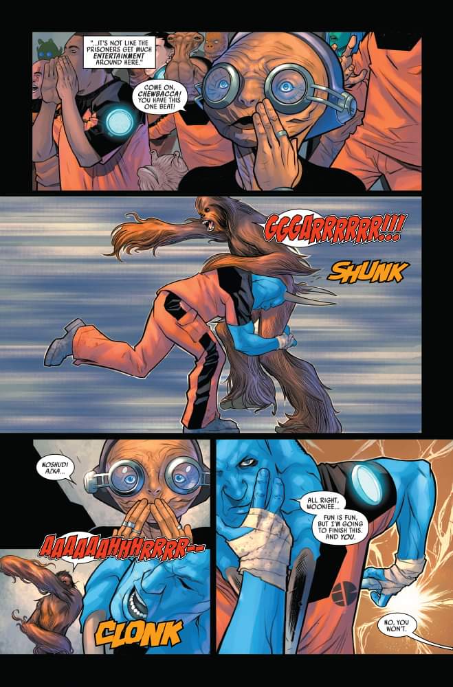 En el primer vistazo exclusivo al próximo cómic Star Wars: Han Solo & Chewbacca #6 de la editorial Marvel, las cosas no han ido tan bien para nuestro Wookiee favorito. Falta el Halcón Milenario. También lo es cierta urna que él y Han fueron contratados para entregar a Jabba the Hutt. Se presume que Han está muerto. Y ahora Chewbacca está atrapado en una gran, gran cárcel. Chewie se encuentra en el planeta prisión de Gulhadar, y tiene algunos problemas para hacer amigos.