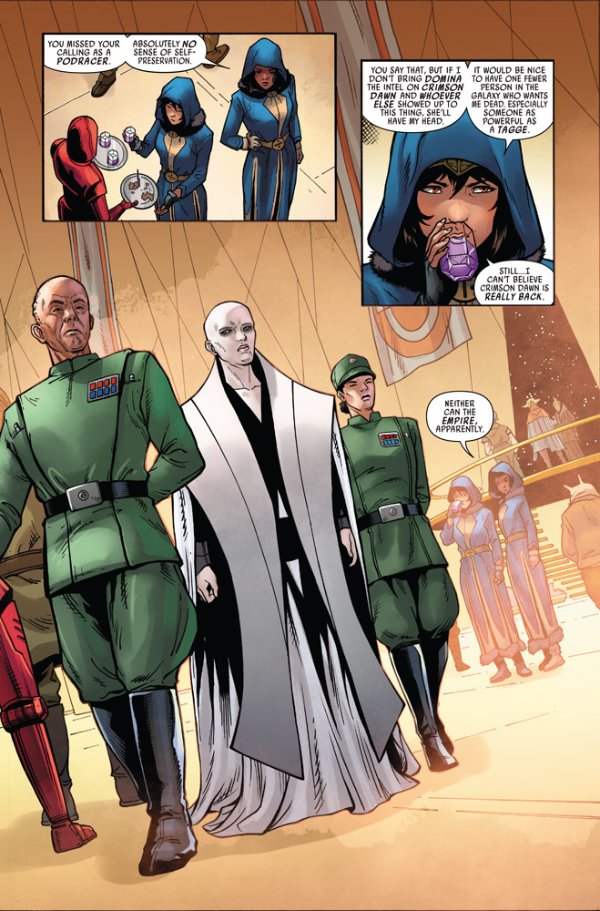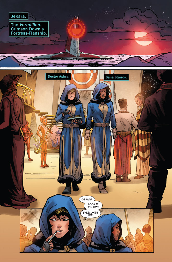 Más tarde, Aphra y Sana llegan al yate para encontrarse con un panorama caótico, la emperatriz Opal y Ebann estaban adornando inertes el escenario. Allí encuentran la invitación del Crimson Dawn y Sana parece sorprendida por el regreso, sobre todo cuando se trata de Qi’ra. Quizás haya algo de conexión en el paso entre ambas, ya que sabemos que Starros formaba parte del equipo Solo, en el pasado.