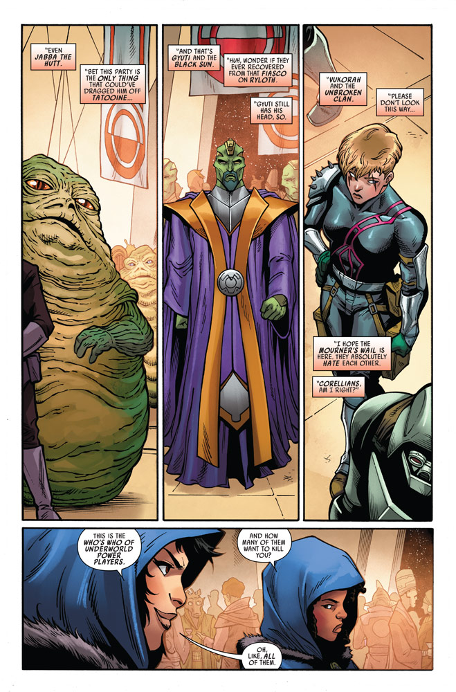 Aphra y Sana no pierden un segundo y suben al Vermillion, la nave del Crimson Dawn, fingiendo ser parte de los negocios de la familia Tagge, como Domina lo sugirió. Era un encuentro único, como nunca antes ellas había visto, Jabba, Black Sun, Vukorah y el Clan Inquebrantable, también la consejera del Emperador, Sly Moore, todos en un mismo lugar.