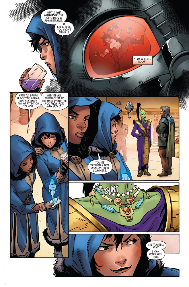 En la barra del bar, Aphra consume un trago con Sana a su lado, de pronto un corpulento y misterioso encapuchado con voz de clon (presuntamente Boba Feet) la sujeta del brazo y le dice que es un aliado y necesitará de su ayuda. Las mujeres no tienen mucha opción, cuando aceptan la propuesta, comienza la subasta. Adivinen quién es la pieza más deseada de la noche, nada más y nada menos que el Capitán Han Solo en su versión carbonita.