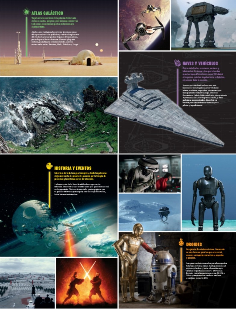Cada volumen analiza un tema en profundidad: desde los personajes situados a ambos lados de la Fuerza hasta las naves y armas que utilizan, pasando por los planetas que integran la galaxia y los droides que pueblan esos mundos.