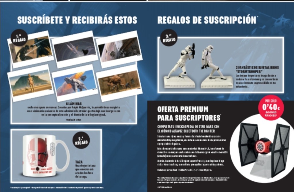 Con la suscripción, tendréis regalos que os llegaran con cada entrega, como una camiseta de Kylo Ren, dos sujetalibros de stormtroopers, seis láminas, una taza y la entrega 3 gratis. Además, para los suscriptores premium, un bluetooth con forma de TIE Fighter de la Primera Orden.