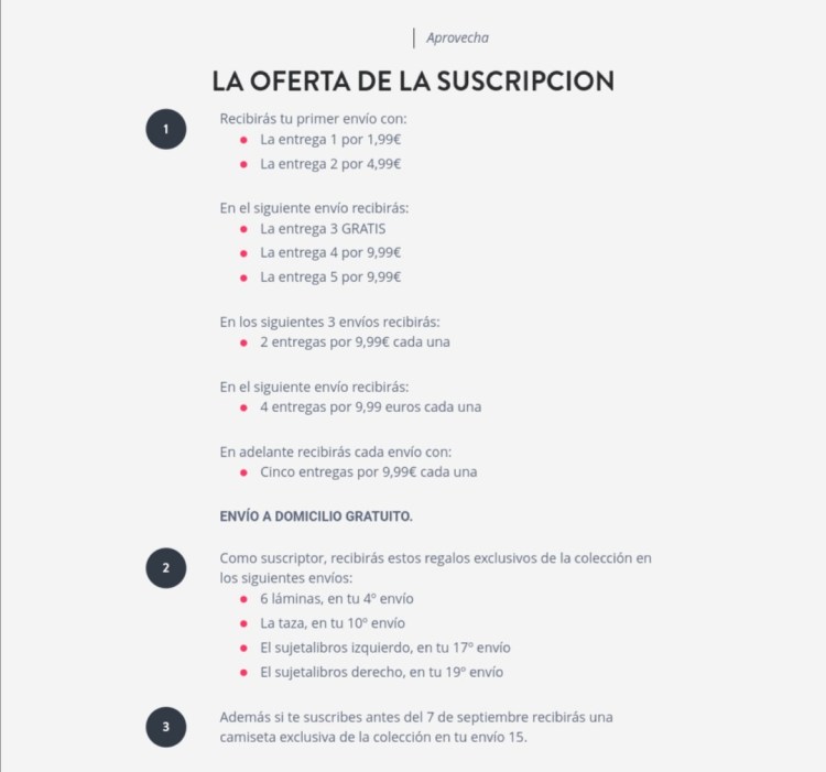Se trata de una vasta colección, que aparentemente tendrá 90 tomos, y cuya primera entrega costará 1,99€ y a partir de ahí 9,99€, aunque con la oferta de suscripción las primeras entregas abaratan un poco el precio y tendrá regalos exclusivos.