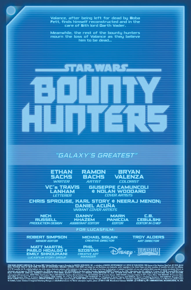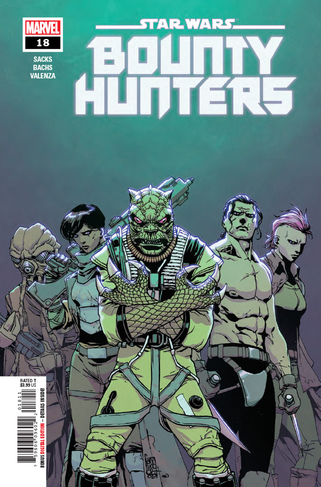 Bounty Hunters #26, escrito por Ethan Sacks e ilustrado por Paolo Villanelli, con una portada de Giuseppe Camuncoli y Jesus Aburtov, también llega el 10 de agosto y está disponible para pre-pedido.