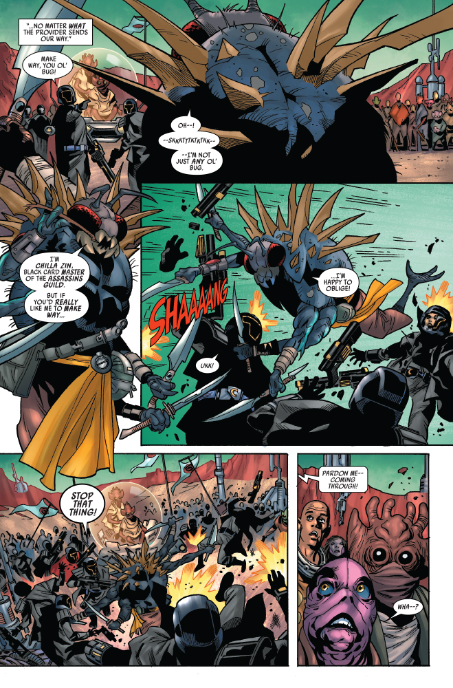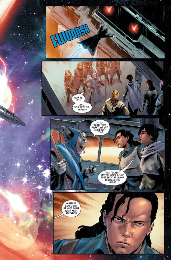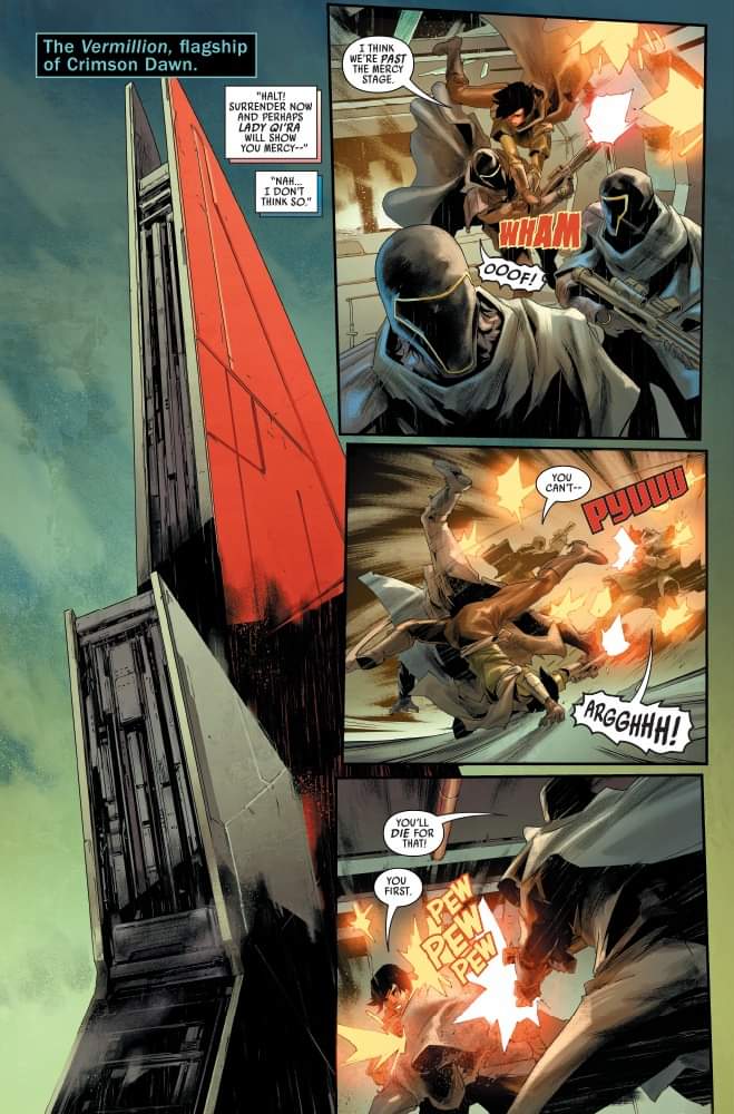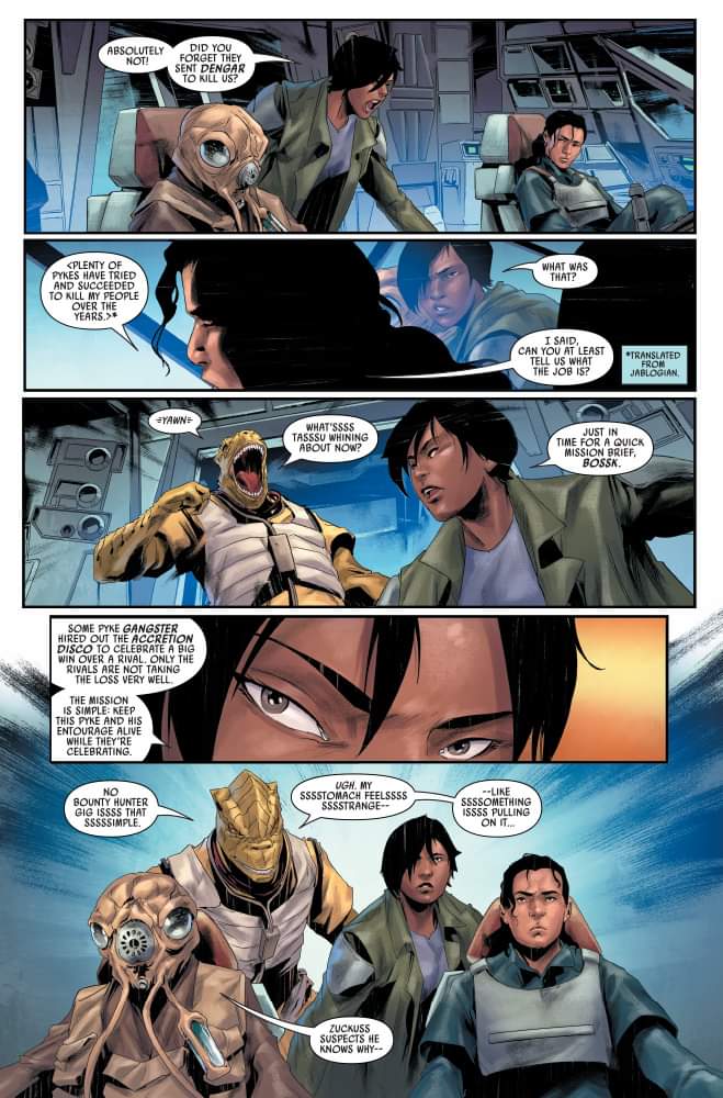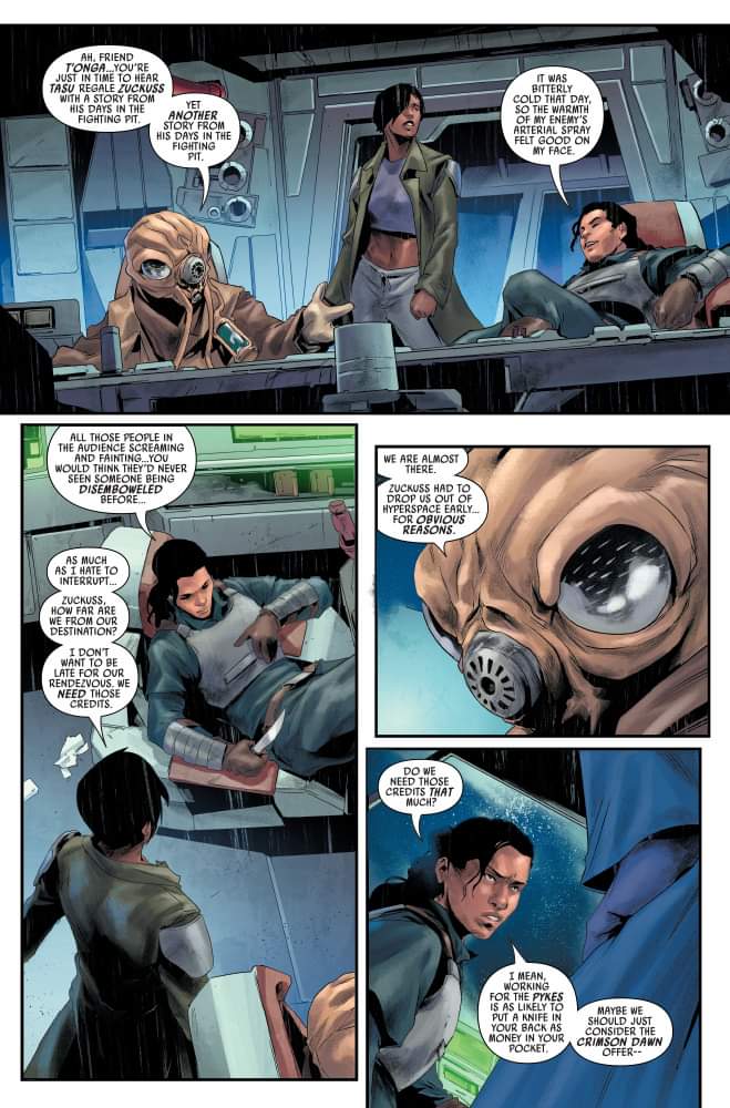 Habiendo fracasado en su misión contra el Crimson Dawn, T’onga y su equipo se encuentran muy solos y sin créditos. En el primer vistazo exclusivo al próximo cómic Star Wars: Bounty Hunters #27, una T’onga desesperada lleva a su tripulación a una reunión con el Sindicato Pyke, que nunca es un buen socio comercial. Mientras tanto, Beilert Valance sigue adaptándose a su nuevo papel como exterminador de topos de Vader. Solo que él está empezando a hacerse notar…