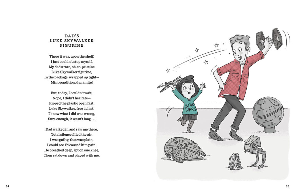 En un formato que recuerda a los libros a menudo absurdamente divertidos de Shel Silverstein, la obra de arte de Budgen visualiza los sueños de un niño de 10 años de jugar a buscar con una mascota AT-AT, una niña que escapa del Imperio en su T-16 Skyhopper, y más mientras Doescher, quien anteriormente escribió las versiones de Shakespeare de la saga Skywalker, captura el juego precoz e imaginativo inspirado en la galaxia de Star Wars, con poemas que riman y son adecuados para los fans mas jóvenes y o los jóvenes de corazón.