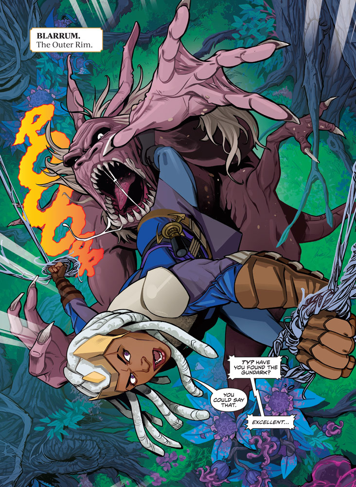 Avon Oeming vuelve a Star Wars tras una brevísima aportación con una ilustración para la revista Star Wars Gamer en 2002. Su estilo es sencillo y muy personal, muy divertido en general, aunque a veces demasiado caricaturesco. Nos ha sorprendido la composición de las viñetas, que sigue el modelo de arcos que pudimos ver en Battle Tales, como mostramos arriba.