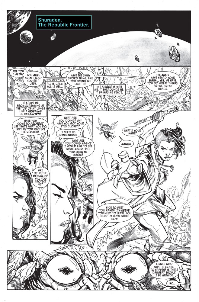 Después de todo, parte de la diversión de crear Star Wars hoy es aprovechar las décadas de tradición que ya existen con los creadores que se enamoraron de la saga como fans. “Ayudar a construir esta parte del mito de Star Wars es un sueño para todos nosotros en Marvel”, dice el editor de Marvel Mark Paniccia. Por ejemplo, las pequeñas criaturas aladas que Keeve encuentra en Shuraden son los Ximpi, “una raza que uno de mis colegas arquitectos de la historia de la Alta República, Charles Soule, creó para la miniserie Lando Calrissian en 2016”, agrega Scott. “Los amé entonces y cuando volvieron a aparecer en Doctora Aphra, no pude resistirme a ir a su planeta de origen. Una cosa que aprenderemos sobre Keeve es que siempre está recogiendo niños abandonados y extraviados en sus viajes. Ella simplemente no puede ayudarse a sí misma».