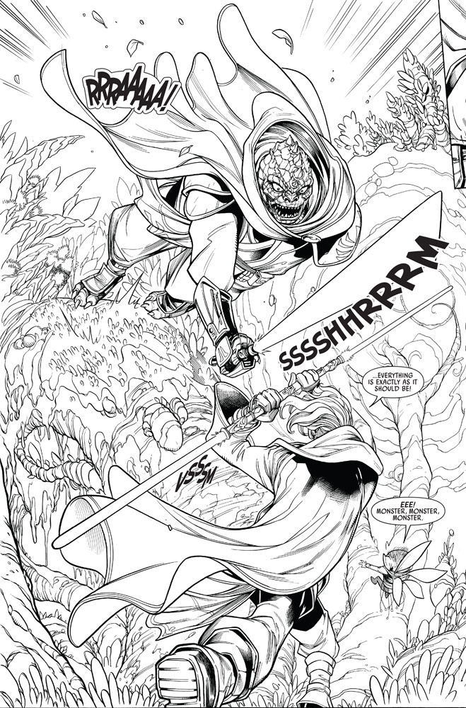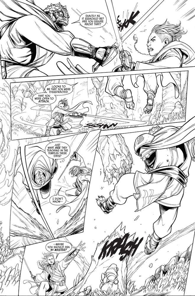 En la vista previa exclusiva de StarWars.com de las primeras páginas del número de debut, vemos por primera vez al maestro y a la aprendiz en acción, mientras Keeve comienza su prueba Jedi bajo la atenta mirada de su maestro, Sskeer. “Pero, por supuesto, no todo va según lo planeado…” dice Scott.