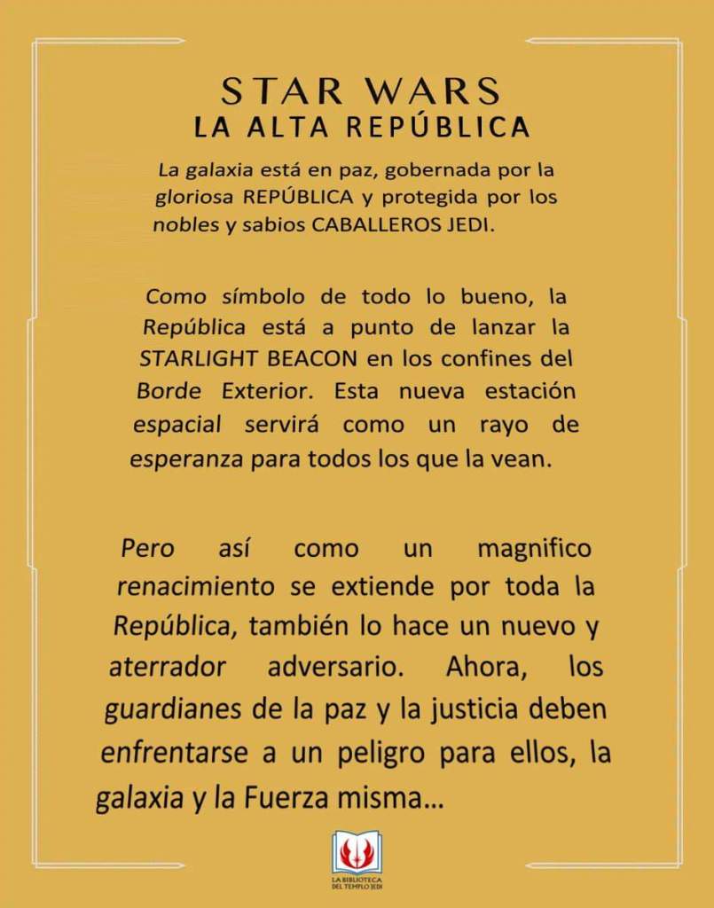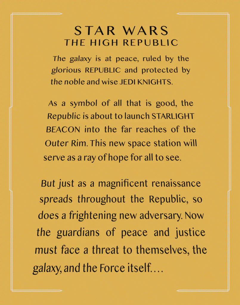 «La galaxia está en paz, gobernada por la gloriosa REPÚBLICA y protegida por los nobles y sabios CABALLEROS JEDI. Como símbolo de todo lo bueno, la República está a punto de lanzar la STARLIGHT BEACON en los confines del Borde Exterior. Esta nueva estación espacial servirá como un rayo de esperanza para que todos los que la vean. Pero así como un magnífico renacimiento se extiende por toda la República, también lo hace un nuevo y aterrador adversario. Ahora, los guardianes de la paz y la justicia deben enfrentarse a un peligro para ellos, la galaxia y para la Fuerza misma».