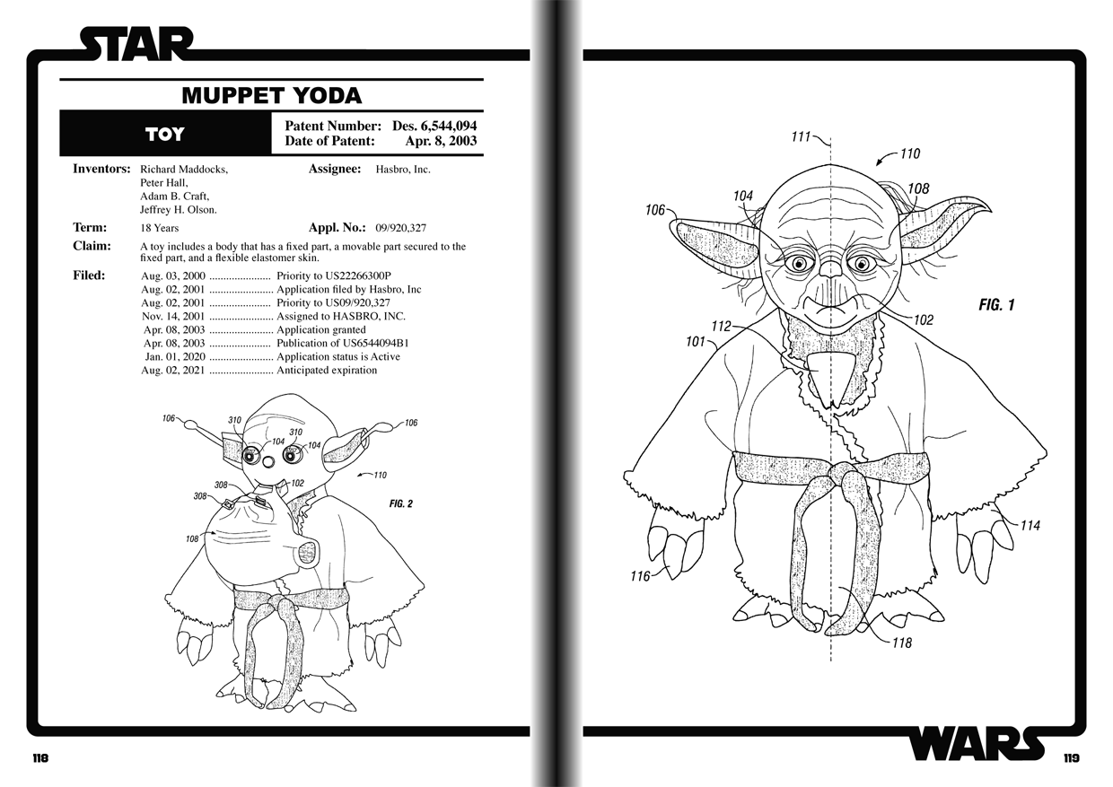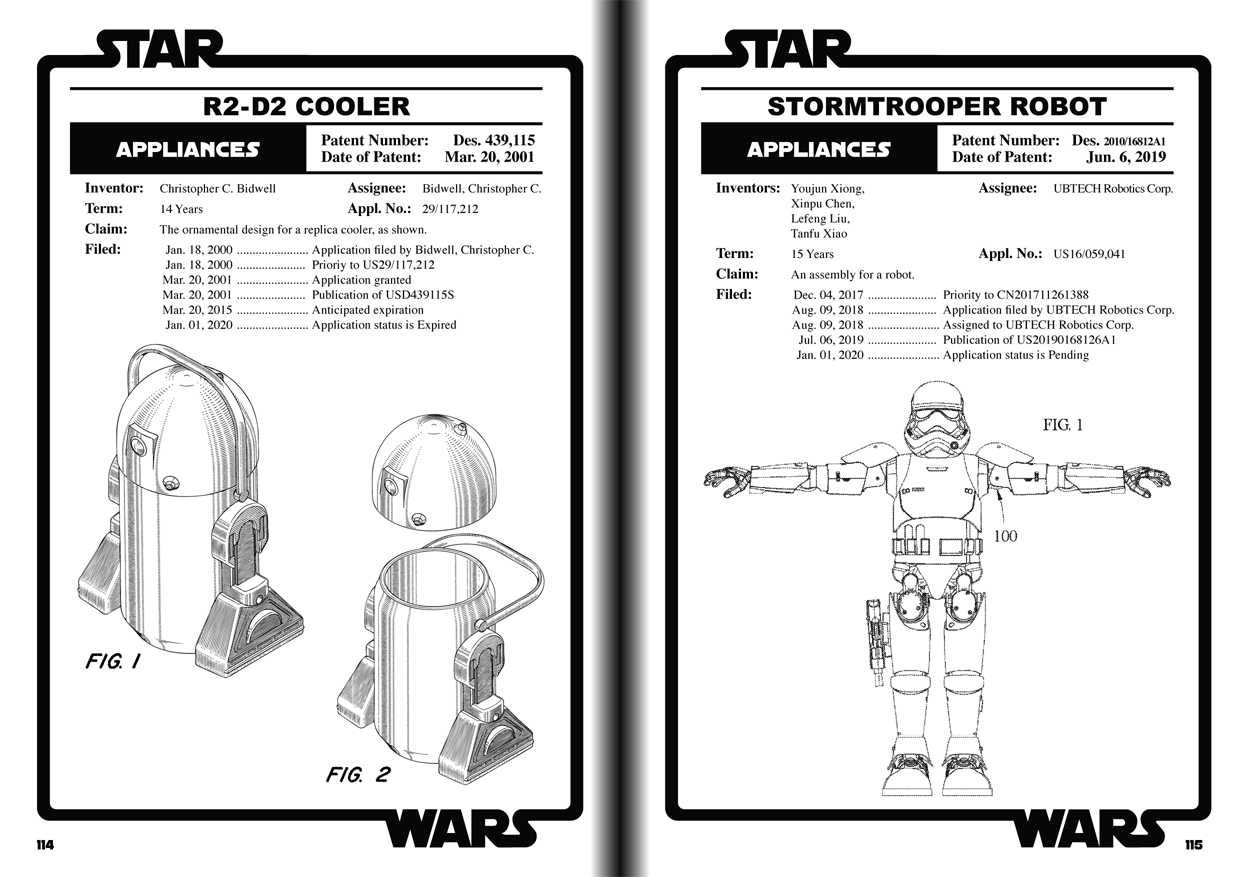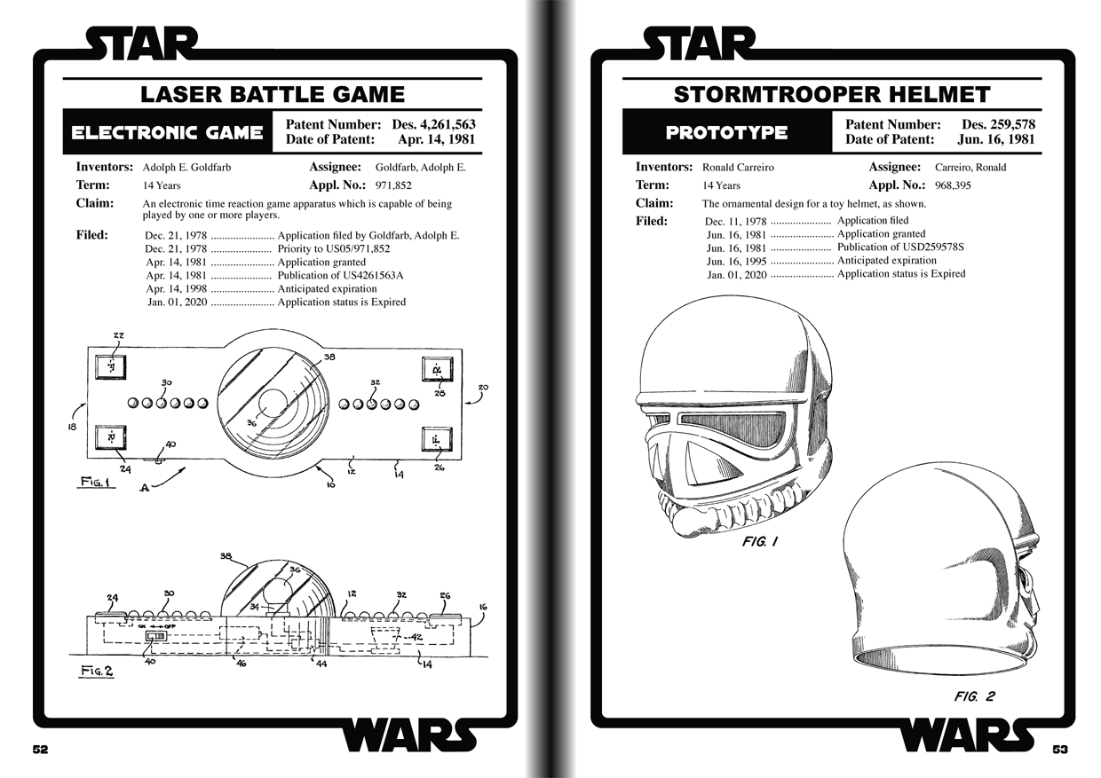 Star Wars: Patent Files from USTPO Archives es una impresionante colección de registros de patentes y esquemas de la Oficina de Marcas y Patentes de los Estados Unidos para más de 70 inventos del universo de Star Wars, desde la famosa figura de Boba Fett hasta un mango de cepillo de dientes Kylo Ren, juguetes, fguras, vehículos espaciales, disfraces de fiesta, motores electrónicos, muñecos… todo en un libro de tapa dura. Una delicia para tus ojos.