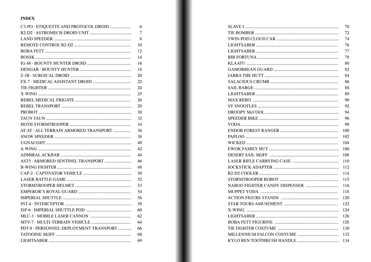 Figuras de acción, naves espaciales, juegos y criaturas como se ve en la trilogía original de Star Wars se mostrarán como mapas del tesoro en plano con información diversa en cada página. Cada página describe las características de los objetos distribuidos en las tiendas entre 1978 y 1985. Un viaje por nuestras infancias.»