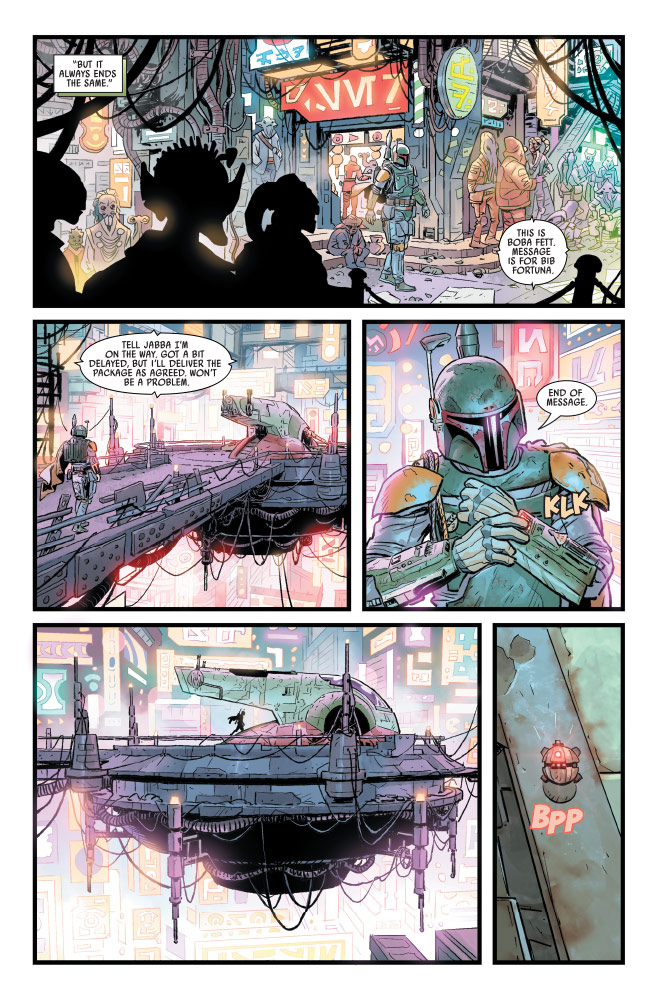 Neeraj Menon también ha pasado por varias miniseries del nuevo canon (Target Vader, Era de la Rebelión…) y aporta una frescura y un estilo que son una delicia. Siendo la primera vez que hace tándem con Luke, parece que su trabajo esté hecho para ser disfrutado en conjunto. Tener un Nar Shaddaa y unos cazarrecompensas tan coloridos, luminosos… Maravilloso. Un disfrute visual con una paleta cromática riquísima. Queremos seguir viendo a este dúo.