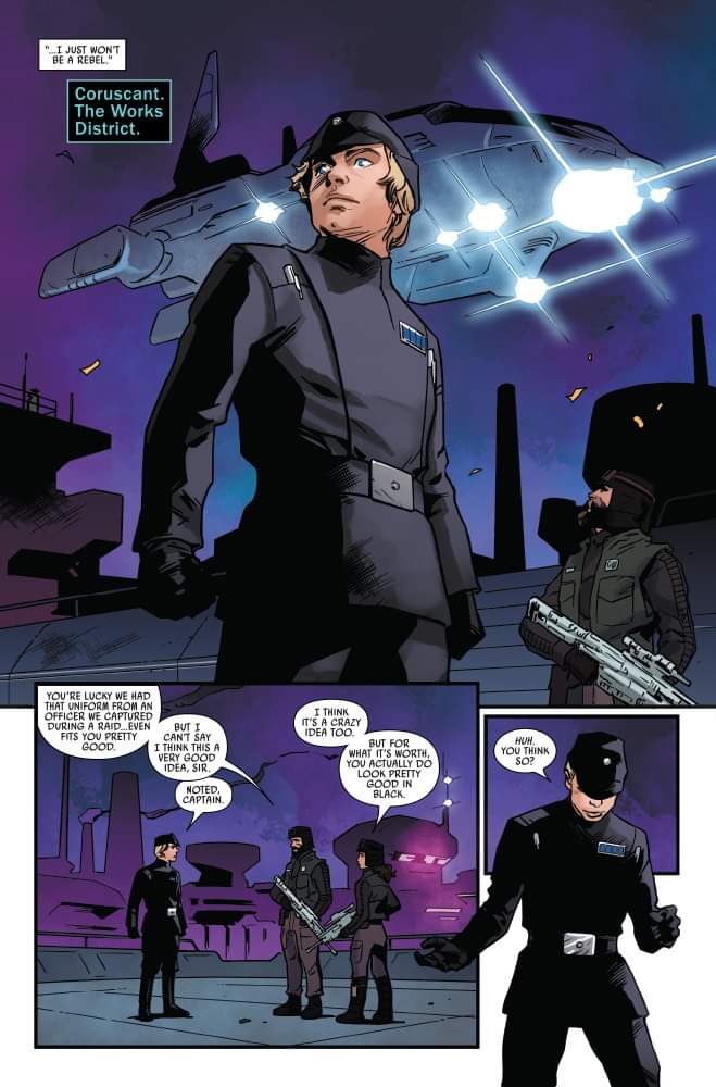 En la vista previa exclusiva del próximo cómic Star Wars #29, Luke Skywalker, Leia Organa y Amilyn Holdo se disfrazan para infiltrarse en una subasta de alto riesgo con la esperanza de ganar una nave de ataque Nihil, una reliquia de la era de la Alta República (The High Republic).