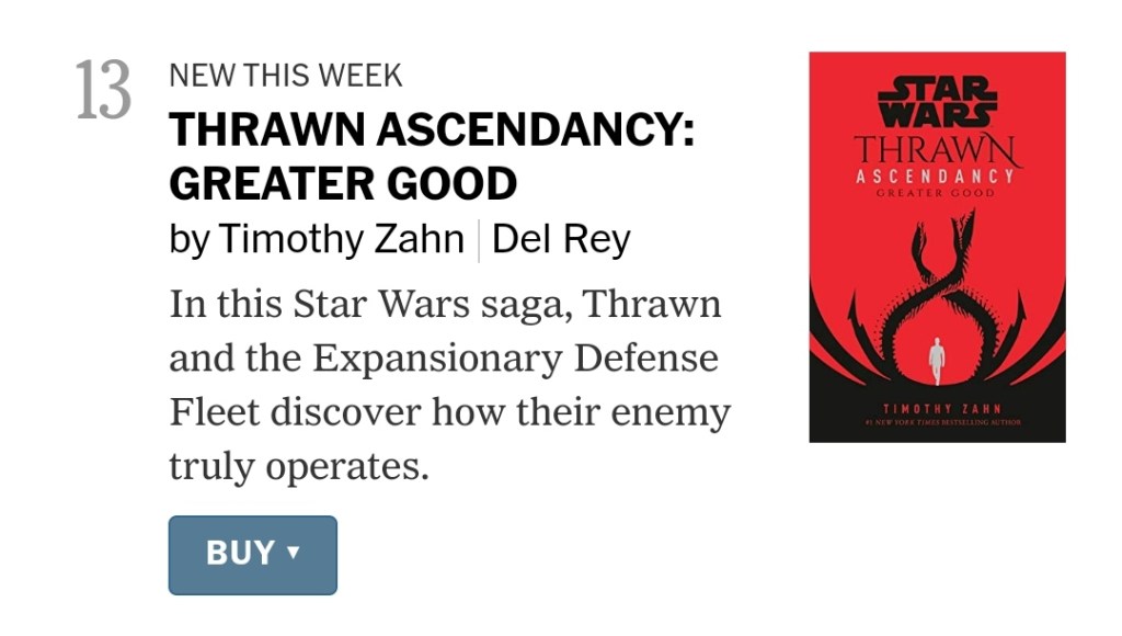 Acabamos de descubrir gracias al propio Michael Siglain, director Creativo de las Publicaciones de Lucasfilm, del éxito de salida de la nueva novela de Timothy Zahn, la segunda parte de su nueva trilogía sobre su personaje fetiche, Thrawn, que lleva por nombre Star Wars Thrawn Ascendancy: Greater Good.
