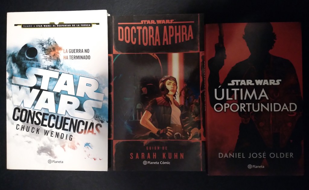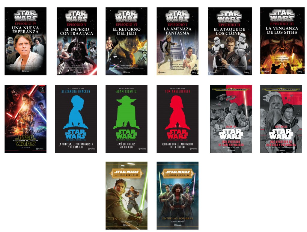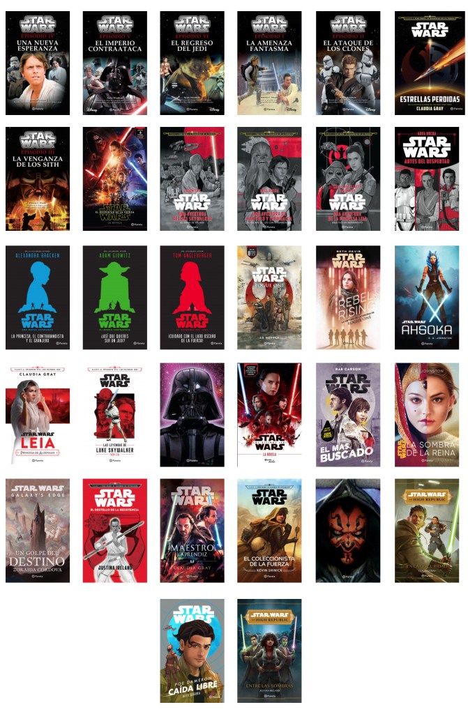 Maestro y aprendiz (enero 2020) Thrawn: Alianzas (mayo 2020) *aunque salió en julio debido al Covid-19 Thrawn: Traición (noviembre 2020) El ascenso de Skywalker (diciembre 2020) Revan (marzo 2021) *reedición Luz de los Jedi (mayo 2021) El caos crece(julio 2021) Escuadrón Alfabeto (octubre 2021) Las tropas de la muerte (octubre 2021) *reedición Bien común (noviembre 2021) La caída de la sombra (enero 2022) Tormenta creciente (febrero 2022) La armadura mandaloriana (marzo 2022) El precio de la victoria (marzo 2022) Mal menor (abril 2022) Kenobi (abril 2022) Nave esclava (junio 2022) Skywalkers: Una familia en guerra (mayo 2022) *es una biografía novelada Mercancía dura (agosto 2022) Ronin (agosto 2022) *no canónica Doctora Aphra (noviembre 2022) *transcripción del audiolibro La sombra de la reina (enero 2023) Estrella caída (febrero 2023) El peligro de la reina (mayo 2023) Hermandad (mayo 2023) La esperanza de la reina (septiembre 2023) Sombra de los Sith (octubre 2023) Convergencia (noviembre 2023) La batalla de Jedha (enero 2024) *transcripción del audiolibro Cataclismo (febrero 2024) La princesa y el sinvergüenza (abril 2024) Inquisidora: El ascenso del filo rojo (junio 2024)