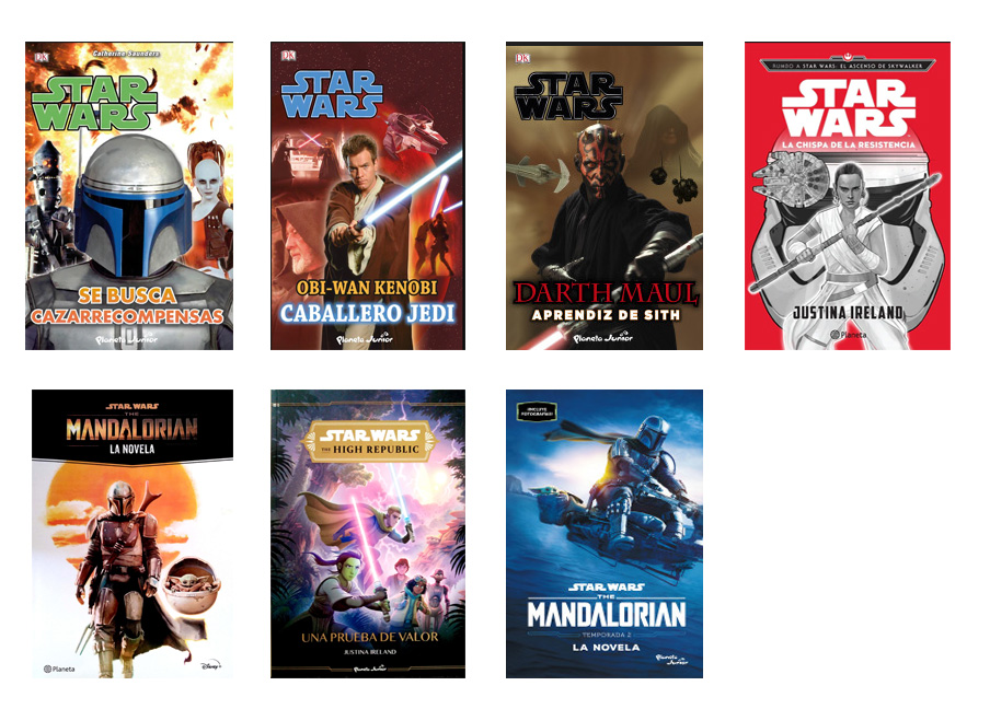 La huida (abril 2017) La trampa (abril 2017) El nido (abril 2017) El robo (abril 2017) La oscuridad (junio 2017) El frío (septiembre 2017) El rescate (septiembre 2017) Aventureras galácticas. Volumen 1 (noviembre 2017) Aventureras galácticas. Volumen 2 (noviembre 2017) La chispa de la Resistencia (noviembre 2019) The Clone Wars: Historias de luz y oscuridad (noviembre 2020) The Mandalorian: La novela (febrero 2021) High Republic: Una prueba de valor (marzo 2021) High Republic: En la oscuridad (abril 2021) High Republic: Carrera a Torre Crashpoint (septiembre 2021) High Republic: Entre las sombras (octubre 2021) The Mandalorian Temporada 2: La novela (septiembre 2022) Padawan (octubre 2022)
