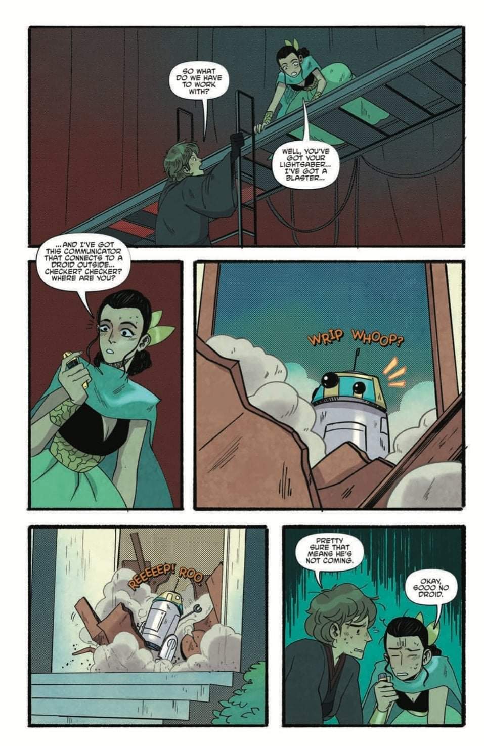 La historia está completamente en la línea de lo que hemos podido ver en Star Wars Hyperspace Stories, el trío precuelas contra Grievous y droides B1. Todos además tienen un aspecto muy similar. Aunque en este caso la composición es mucho más sencilla, ya que se tiene la voluntad de enseñar a leer un cómic por primera vez. Y el recuento de páginas dobla a la publicación de Dark Horse.