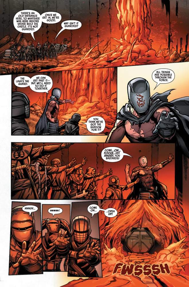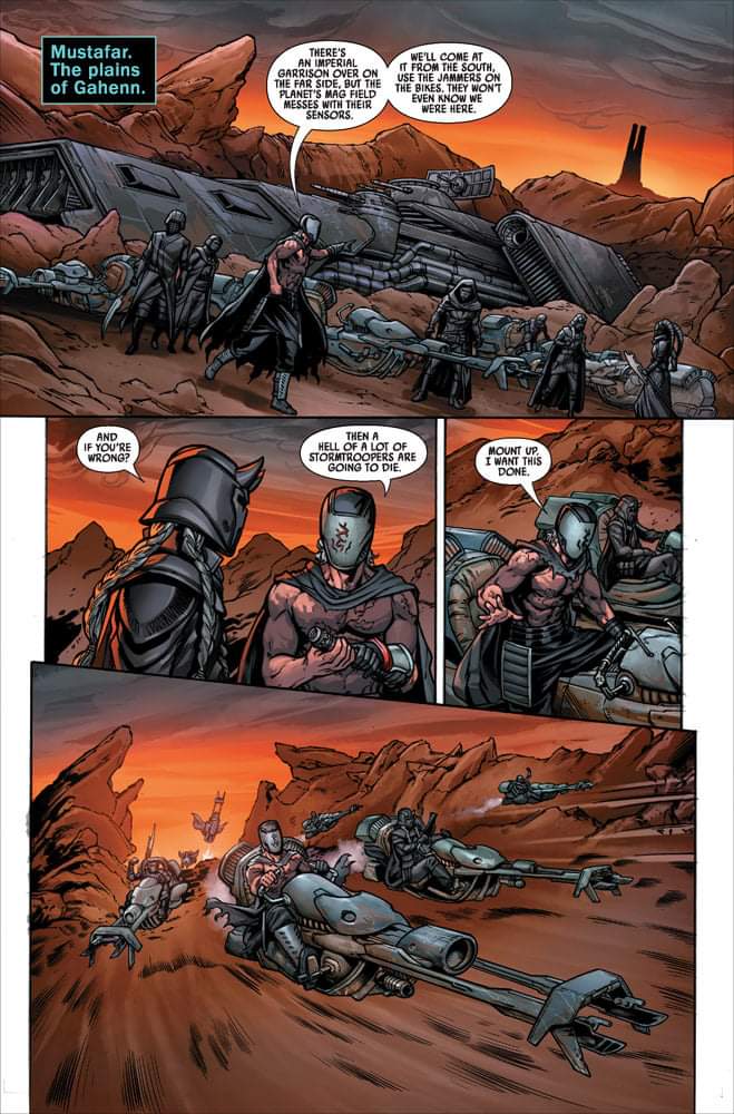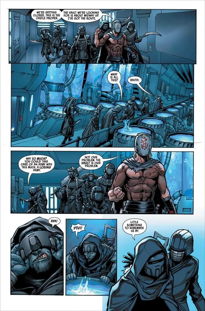Charles Soule entrega un número cargado de lore pero despojado de épica. Muy divertido, con comentarios muy mordaces, y con unos Caballeros de Ren totalmente conscientes de su lugar en el gran tablero de juego galáctico. Volvemos a Mustafar y con toda la iconografía asociada al lugar, desde el Castillo de Vader a las catacumbas con la máscara de Lord Momin, los Lava Troopers, Vanee… No sólo ha recuperado aquello que creó para la serie Lord Oscuro si no que ha tomado prestado todo aquello que Cavan Scott fue creando durante los años que se editaron los especiales de IDW de Vader’s Castle. Además la aparición de esa Screaming Key le da un punto de misterio a la trama muy disfrutable. ¿Qué abrirá esa llave? ¿Por qué la tenía Vader? ¿Qué está tramando Qi’ra?