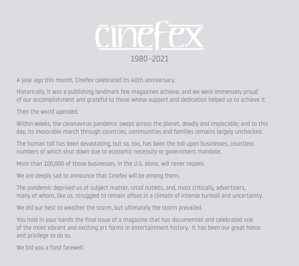 Según palabras de la revista: «Después de 41 años de publicación, en #CinefexNOW estamos tristes de informar que Cinefex 172, recién salida de la imprenta, será nuestro número final. Muchas gracias a todos nuestros fieles seguidores.»