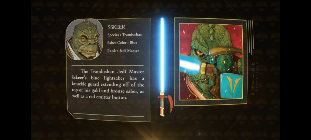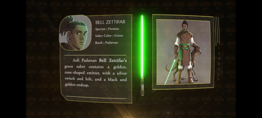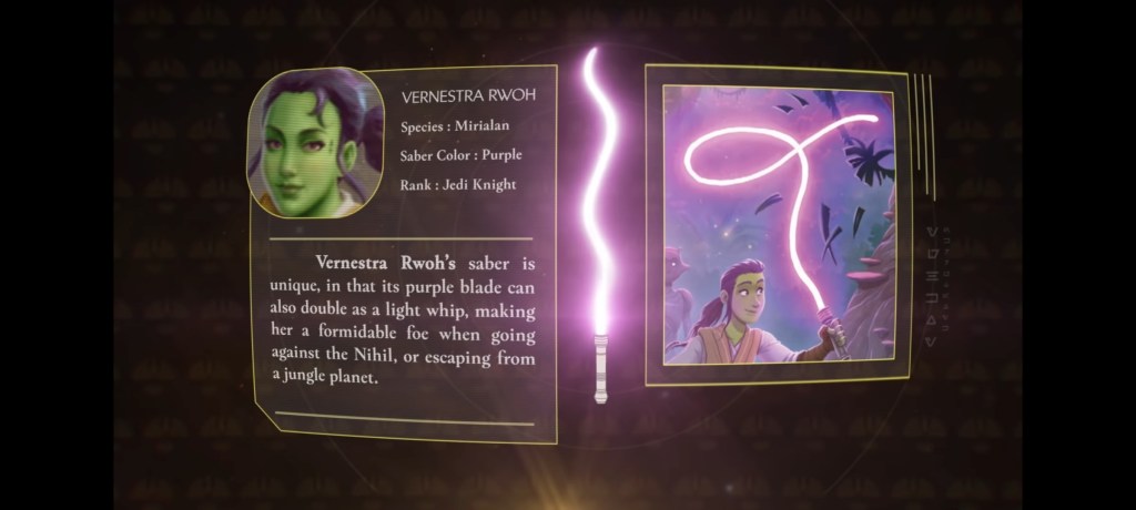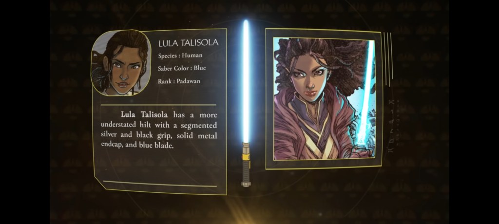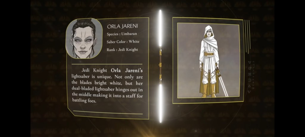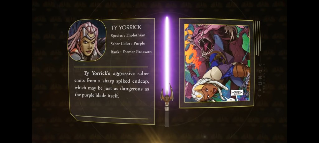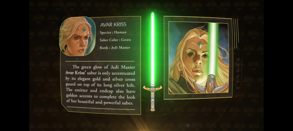 “Este no era un libro sobre los Jedi y no era un libro sobre la Fuerza”, dijo Wallace. “Fue específicamente un libro solo sobre sables de luz. Así que eso fue muy divertido, pensé, porque las restricciones, el enfoque láser de esa dirección lo hacía más interesante «.