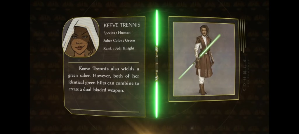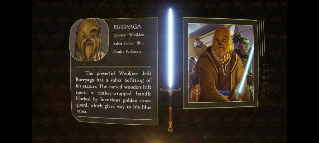 Por ejemplo, el sable de luz de Qui-Gon Jinn tiene citas de Liam Neeson sobre cómo elegir su sable en el set de La Amenaza Fantasma. Las dos entradas de Asajj Ventress, una de sus días como padawan y otra como asesina, tienen citas de la actriz Nika Futterman sobre las motivaciones del personaje. Para algo más antiguo y más conocido, como el sable Skywalker, hay citas del diseñador de escenarios Roger Christian sobre su construcción física. Y algo de lo que no hemos visto mucho, como el sable del wookiee Gungi de The Clone Wars, se centra mucho en la historia donde aparece el sable, porque no hay mucho más que contar.
