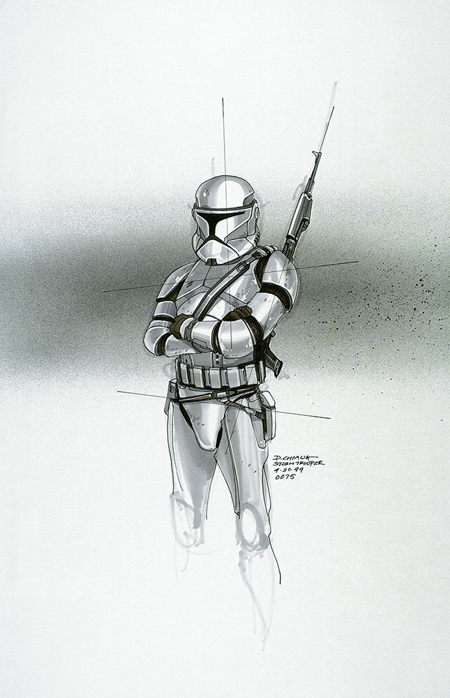 Esto es evidente en la armadura del soldado clon, que hizo su primera aparición en la película. “Esto es lo realmente divertido de trabajar con George”, explicó Chiang. “Quería crear la idea de que la armadura de Jango Fett se convirtió en la evolución de los soldados de asalto. Así que literalmente tomé a Jango Fett y su armadura y básicamente mantuve el diseño original que hicieron Joe Johnston y Ralph McQuarrie. Luego comenzamos a combinarlo con el clásico casco de soldado de asalto que vimos en la trilogía original”. El soldado inicial de la «fase uno» en Clones comparte un diseño de visera en T con Jango y Boba Fett, mientras que los de Star Wars: Revenge of the Sith se parecen más a los soldados de asalto.