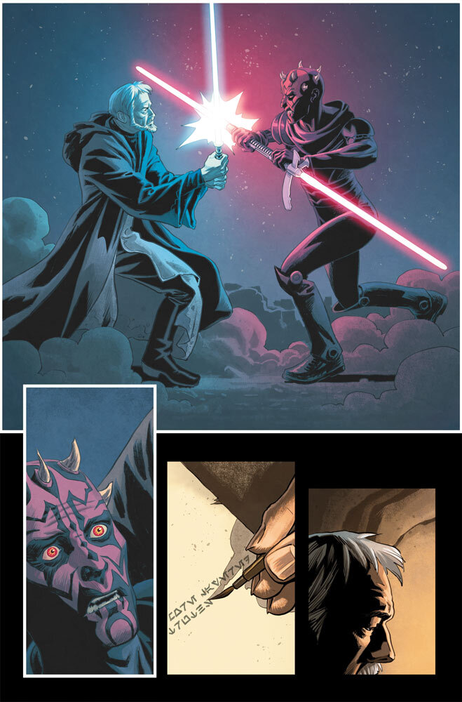 7. Obi-Wan es una serie antología. La versión de Chris Cantwell de Obi-Wan Kenobi es una antología de cinco números que abarca toda la vida del personaje. “El concepto es fantástico para este cómic porque Star Wars, como todo el mundo sabe, es tan enorme e interminable que no sabes por dónde empezar y colocar un alfiler”, dijo Cantwell. El número 1 es una historia de los días de juventud de Obi-Wan, el número 2 lo presenta como un Padawan, el número 3 es una historia de Clone Wars, el número 4 se desarrolla poco antes de que las cosas comiencen a desmoronarse en La Venganza de los Sith, y el número #5 se acerca mucho más a Una Nueva Esperanza.