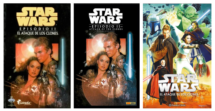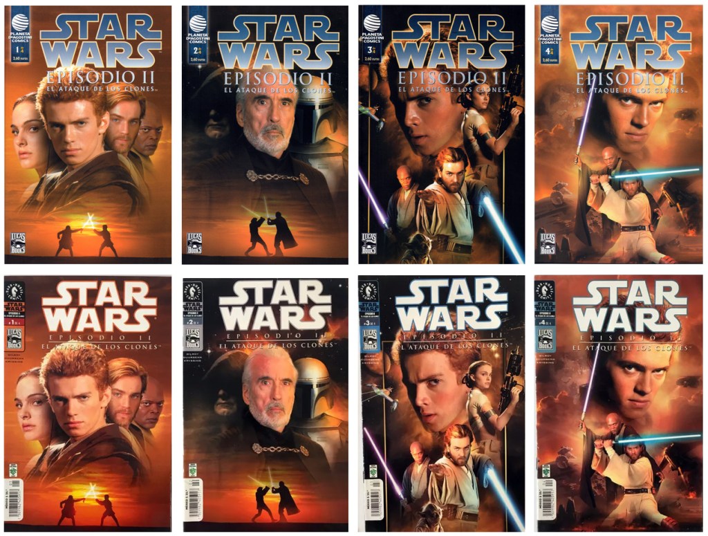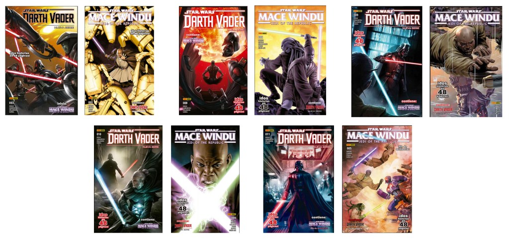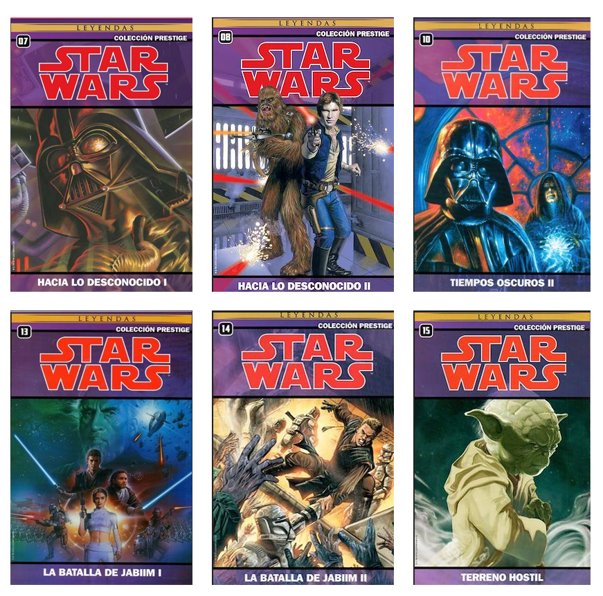 Todas las portadas americanas han sido sacadas de la Wookieepedia, mientras que las fotos de los ejemplares españoles provienen la mencionada web Star Wars Spanish Stuff (los ejemplares de la Star Wars Magazine), los libros de rol de la colección de Carlos Rodríguez Canales, y los relatos incluidos en los videojuegos de tiendas online de segunda mano.