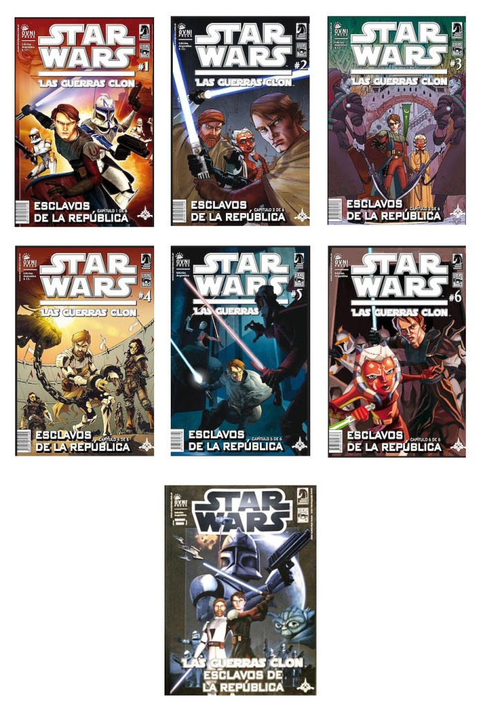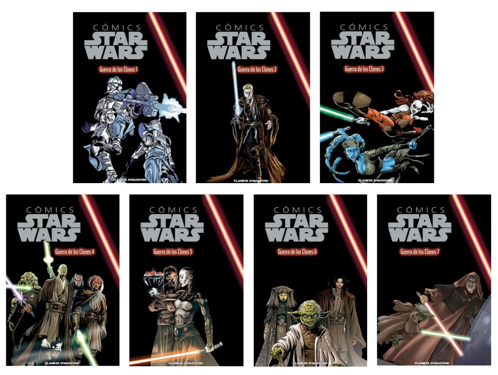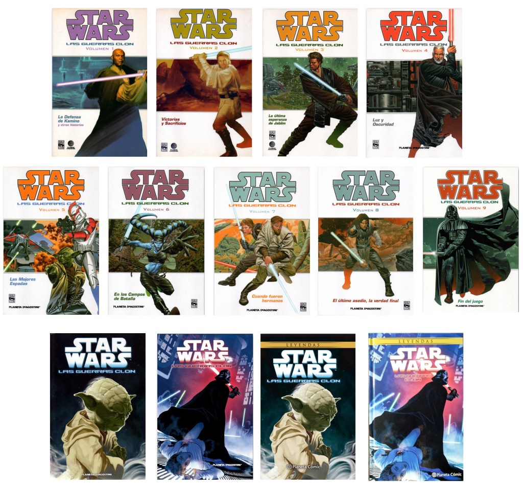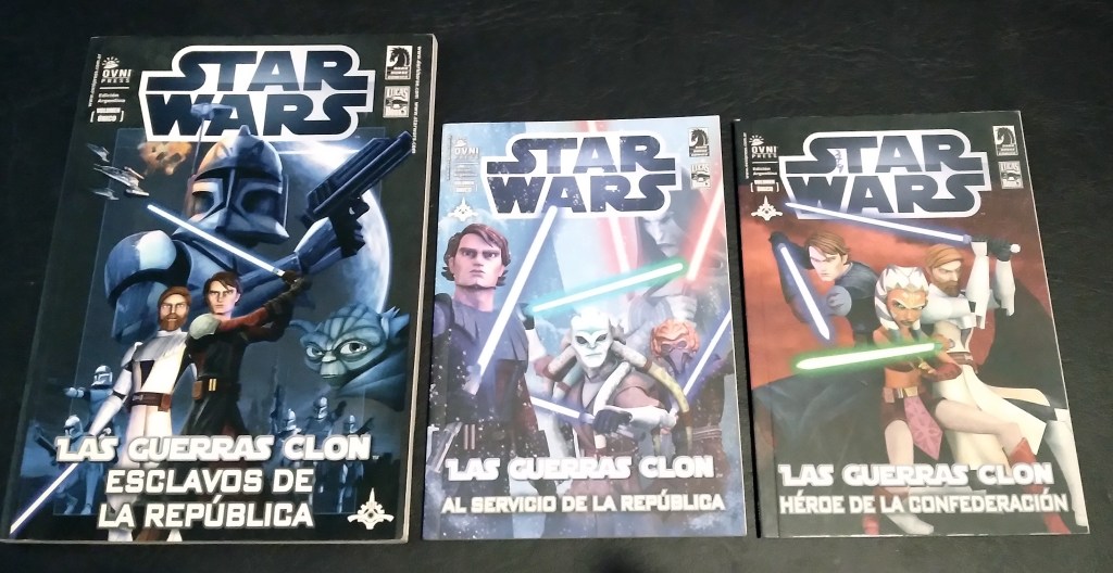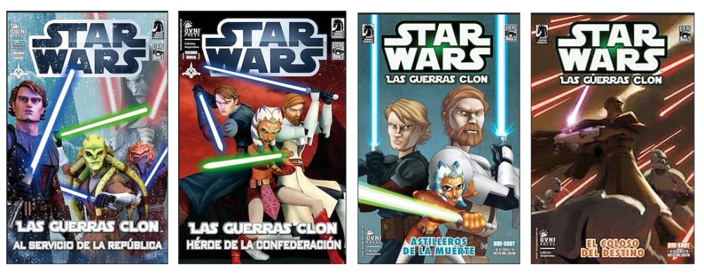 De momento en España únicamente tenemos publicada la antología The Clone Wars: Historias de luz y oscuridad, en noviembre de 2020, escrita por varios autores. Todas las historias son adaptaciones de episodios o arcos de la serie, excepto el último, que se sitúa en el contexto para desarrollar un personaje nuevo, que quizá veamos en el futuro en algún otro producto de la franquicia. La antología ha sido publicada por Planeta Junior y traducida por Marta García Madera. Las historias que contiene son las siguientes: