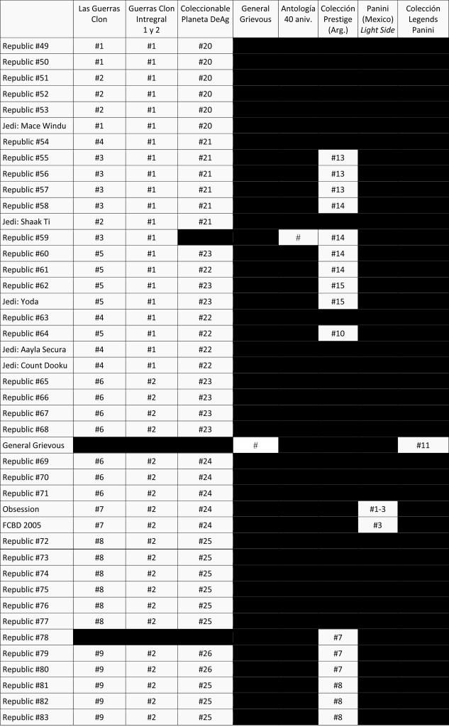 Entonces, sabiendo los relatos que se publicaron, y después de haber listado anteriormente todas las revistas anglosajonas, vamos a identificar en que ediciones originales aparecieron: Sacrificio en Pengalan (The Pengalan Tradeoff) se publicó en la Star Wars Insider #65 (enero 2003), en una sola parte, mientras que aquí se hizo en dos. Misión en Corellia (Elusion Illusion) apareció en el siguiente número, en la Star Wars Insider #66 (marzo 2003), también en una sola parte aunque aquí en dos. El héroe de Cartao (Hero of Cartao) se publicó en las Star Wars Insiders #68-69-70 (junio, julio y septiembre de 2003 respectivamente), en este caso coincidiendo en las tres divisiones de la historia. Liga de espías (League of Spies) salió en la Star Wars Insider #73 (enero 2004) y Escuadrón Omega: Objetivos (Omega Squad: Targets) en la Star Wars Insider #81 (marzo 2005), además de en la edición tapa blanda de Republic Commando: Triple Zero, de la misma autora. Las traducciones corrieron a cargo del equipo de la revista: Guillermo Ruiz, Mireia Bartolomé-Sanz y Javier Parra, siendo Jose Mª Arosa el editor.