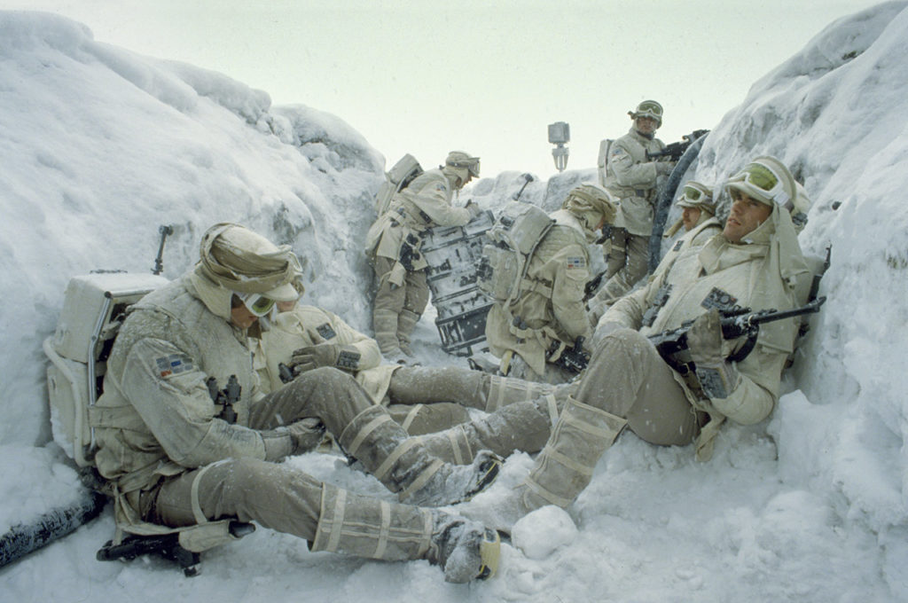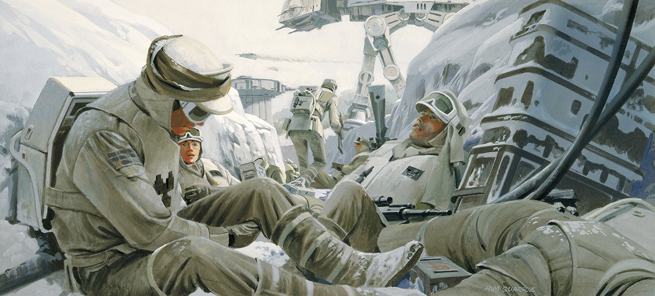 Paralelamente al mundo de los wookiees, cubierto de enormes árboles, McQuarrie ya estaba pintando el hielo y la nieve: basándose en las instrucciones de Lucas, ya que en ese momento no se disponía de un guión terminado, el artista estaba desarrollando el hogar de Darth Vader. Inicialmente ambientado en un entorno frío, el castillo metálico del Lord Sith fue colocado más tarde en medio de lava hirviente, pero no llegó a aparecer en la película de todos modos -su primera aparición sería en 2005 en La venganza de los Sith, aunque en realidad no se llamó castillo de Vader en la película final de la precuela. Algunos de los cuadros conceptuales se convirtieron posteriormente para ilustrar por primera vez la base rebelde en el contexto de Hoth. En los meses siguientes, la estructura metálica desapareció y la base se trasladó al interior de las cuevas de hielo, consideradas naturales del planeta. Tratando de imaginar el diseño de los interiores, Ralph McQuarrie y el director de arte de efectos visuales Joe Johnston imaginaron cómo los rebeldes tallaban el hielo para hacer sitio al hangar y al equipo: «Tuve la sensación de que se utilizaría el láser para realizar el corte en líneas largas y rectas. Eso me ayudó a dar la clave de parte de la solución».